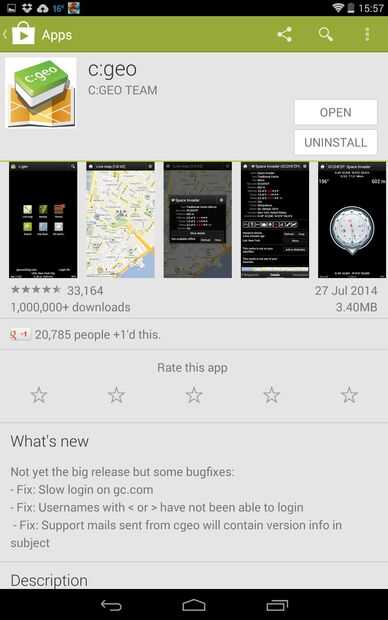 En la Play Store, busque "c:geo" y descargar la aplicación. Una vez instalado, lanzar la aplicación y sesión en el Geocaching.com y haga clic en los botones de información de verificación. Después de eso, presione el botón back al lado del botón Inicio Android. Usted notará que usted puede inscribirse en más de una página web. Ingrese a todo lo que quiera pero uno realmente es suficiente. Después de eso ir a la pantalla de inicio. Ahora empieza la diversión!!!!!!
