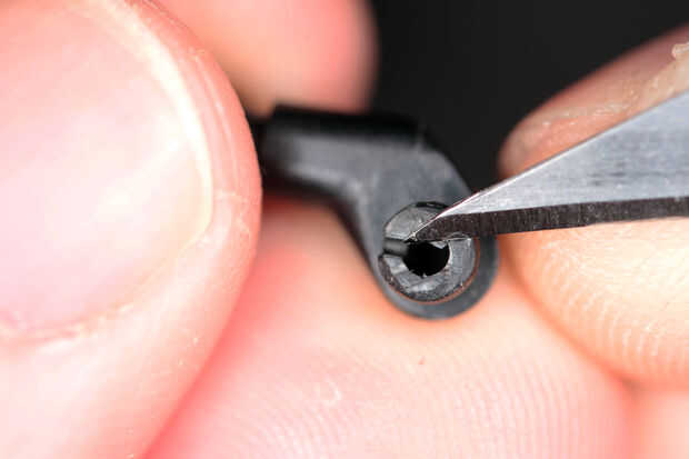 En serio... usando una Dremel para perforar pequeños agujeros podría compararse a aplastar moscas con un canon atado a la espalda mientras que monta un potro salvaje. Es muy fácil de tomar demasiado apagado y una Dremel crea un montón de calor en el proceso - no es bueno. Si usted lo toma lentamente con un taladro de empuje y use brocas afi ladas - puede ejecutar limpiamente los cables dentro y por fuera. Usar las mechas de 1/32 pulgadas por lado, 3/64 en el brazo y el hombro y 1/8 en las cosas grandes. Trate de no dejar la broca 'bamboleo' todo conforme taladra... a menos que quieras que.