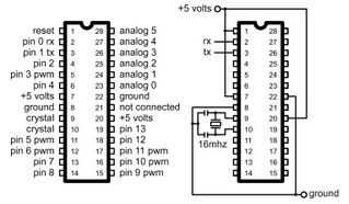4. seguir el esquema de la arduino independiente y conectar 16 mhz cristal al pin 9 y 10 no importa que dirección y conectar los condensadores.