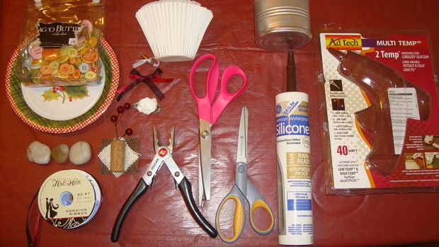 6. Adornos de la can: cinta, corcho, yute, botones, lentes miniatura, arpillera, pequeña flor y Planchuela de desierto.