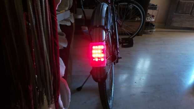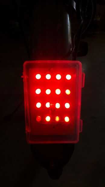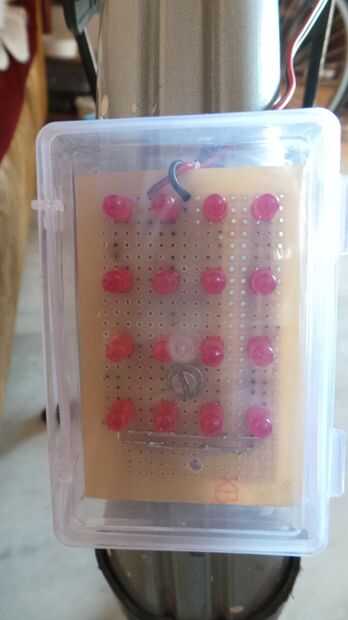 Construcción de luces de LED de 4 x 4 en PCB perforado y soldadura de suficiente longitud de cable. Puede consultar el diagrama del circuito en la foto de arriba. Después de hacer el arreglo de discos, colocar en una caja de plástico transparente para protección y perfore un agujero en la caja de plástico para montar en el ciclo. Puede utilizar un tornillo de 4mm para fijar en la bicicleta.