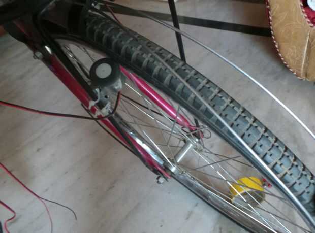 Velocidad puede generar electricidad! Aquí está un pequeño 3 v Dc motor con abrazadera a la moto con ataduras de cremallera cerradura. Una rueda pequeña esponja se une al eje. Asegúrese de que la rueda toque ligeramente de la llanta.