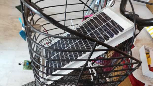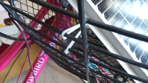 También es fácil ahora de montaje del panel solar. Pero se vuelve más fácil con las cerraduras del cierre relámpago! Zip lock lazos son los mejores para atar cualquier cosa. Elija un lugar conveniente para montar el panel solar, especialmente entre las asas de ambos. Asegúrese de que el panel tiene un marco de aluminio alrededor de él de modo que pueden taladrarse agujeros. Se hace un agujero en el centro de la estructura en ambos lados para zip bloqueo al portador delantero. Asegúrese de haber soldado suficiente longitud de cable en las fichas del panel.
