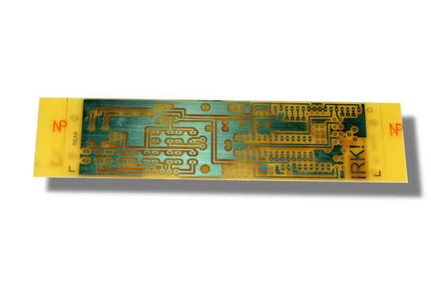 - Hacer un vaso de fibra doble cara PCB (ver archivos de PDF de frente y parte posterior abajo). Hay varias formas de hacer esto. La manera de hacerlo es imprimir los archivos PDF y transparencias inkjet con el más alto nivel de calidad. No importa si usted imprime espejada o no porque siempre puede voltear la transparencia. Línea de las transparencias y cinta a lo largo de un borde para mantenerlos alineados. Corte algunos Kinsten positivo resistir PCB para tamaño y desprenderse de las capas protectoras. Inserte la placa entre las dos transparencias cuidadosamente Alinee la transparencia a la PCB y sujete la porción entre dos piezas de vidrio mediante clavijas o lo que sea. Ahora que se han pelado las capas protectoras, la capa fotosensible en el PCB es ahora expuesta a la luz, así que trate de mantener fuera cualquier accidentales fuentes luz UV (por ejemplo, el sol, luces fluorescentes, soldadores de arco, etc.). Utilice una lámpara de escritorio fluorescente ordinaria para exponer cada lado durante 10 minutos a una distancia de unos 5 cm. desarrollar con el desarrollador de DP-50 hasta que claramente se ven las pistas. Luego grabe usando cloruro férrico.