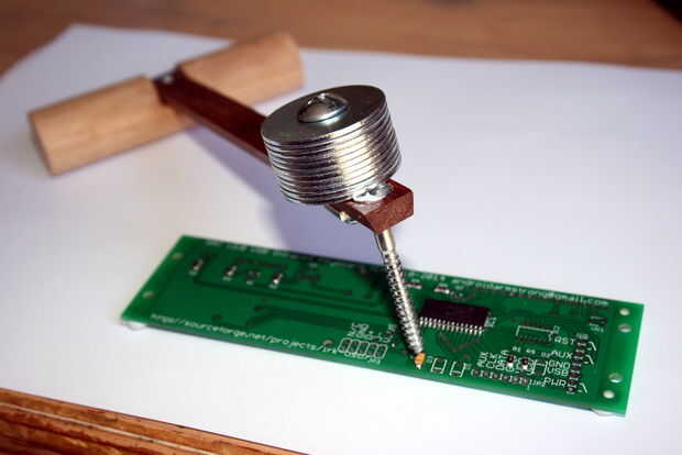 Con un PCB de doble cara a veces las pistas en un lado de la Junta necesitan estar conectado a las pistas en el otro lado. Esto se llama una "vía". Tableros fabricados tienen platear-por los agujeros para ello (que es la magia de fabricación que no sé nada). Para tarjetas hechas a mano usted puede ya sea soldadura, a ambos lados, un pedazo de alambre de núcleo único a través de la vía agujero - o usted puede hacer esto... que creo que es más fácil: