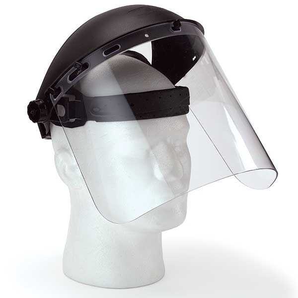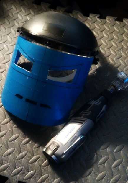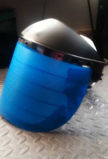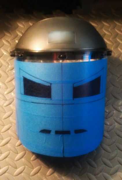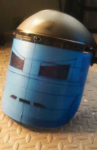 Una protección facial careta, cinta el escudo delantero con cinta azul y a mano alzada los ojos y la boca entonces utilizan una Dremel para cortar.
