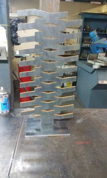 En primer lugar debe diseño en un software específico (por ejemplo autocad, illustrator, entre otros) la escultura que desea construir. Luego tienes que cortar con chorro de agua corte de equipo.