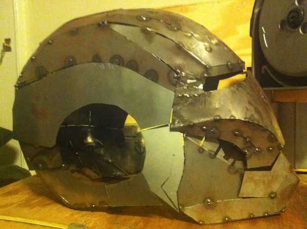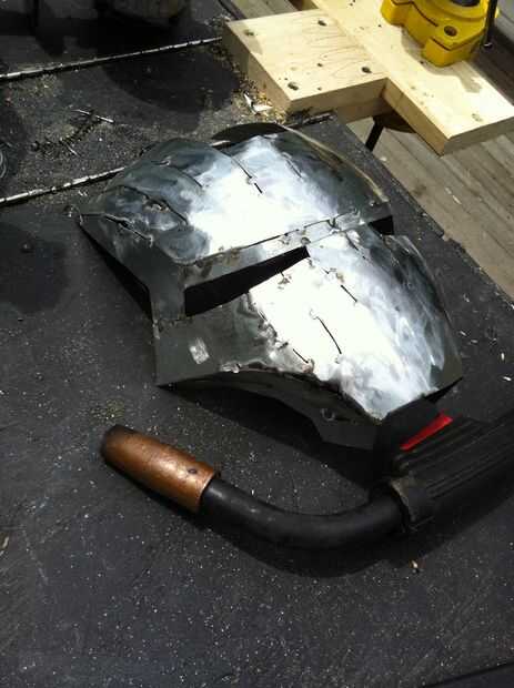 Cuando tengas las piezas en forma de la manera correcta, Inicio quema eso acero! Comience con la velocidad de calor y cable soldador como lento y frío como sea posible. Recomiendo usar un soldador MIG. es mucho más limpio que flujo base alambre soldadura. Cuando encuentres una buena velocidad y el calor que no quemado demasiado mal en este calibre pequeño, comience extendiéndose su clava con tachuelas para obtener la forma básica del casco. Construido este casco sobre todo como una sola pieza y sólo ligeramente virado en las partes que planeo volver y bisagra/motorizar. Esto mantendrá las proporciones / simetría en cheque y ayuda moral del proyecto, porque en este punto han pasado mucho tiempo con la esperanza de ver una cara de Ironman acero volviendo a usted. Hacer tan.