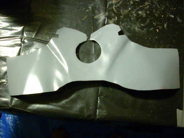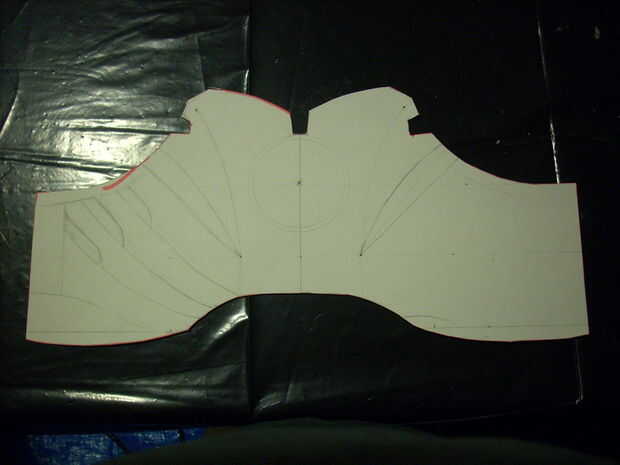 Hace un patrón de cartulina del pecho y luego había reproducido en la espuma. También entonces uno de los manteles individuales de corte en el mismo patrón. Basado en las proporciones de todo que subió con un tamaño de agujero para la luz del pecho. Encontre llave luces en la tienda que por casualidad eran exactamente ese tamaño. Esto vinieron en un pack de tres.