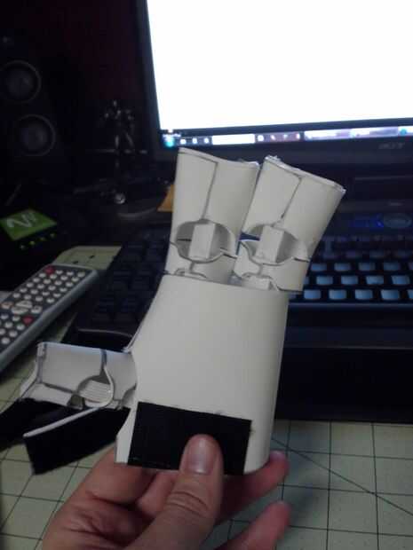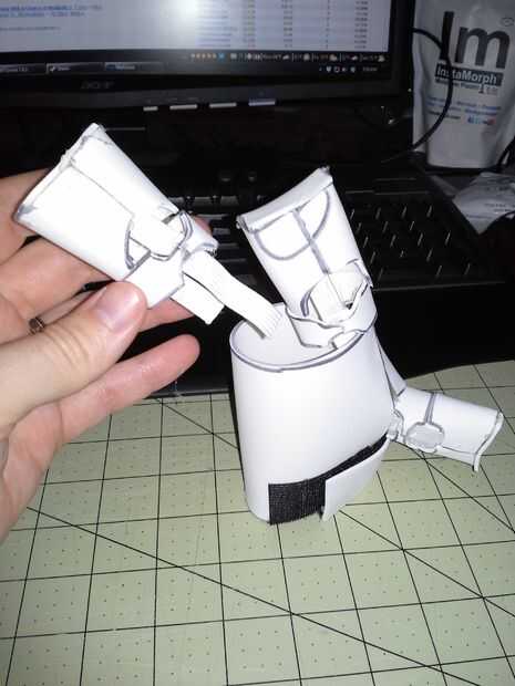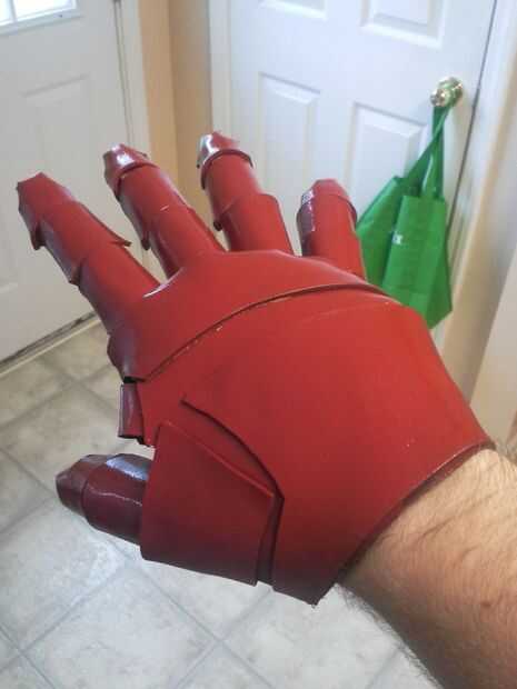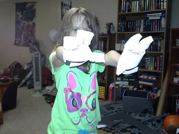 Las manos sólo construido usando el mismo proceso como hacer guantes de Ironman (Palma y extra ancho 3 dedos para caber todos los dedos en) volví y agregó una luz LED para la palma derecha para simular el blaster.