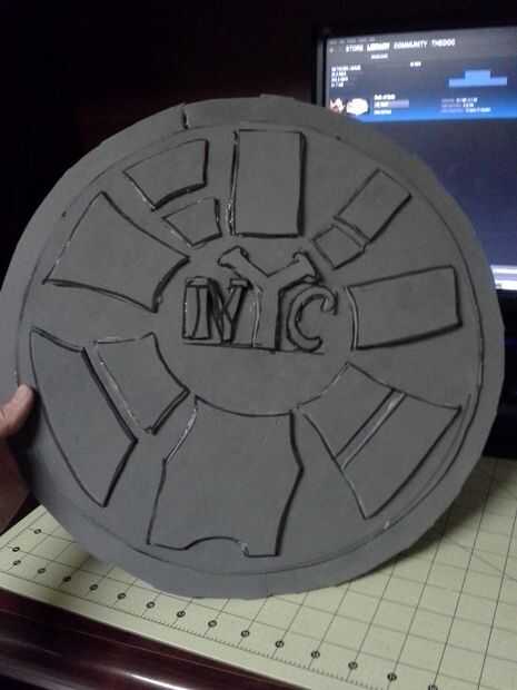 La concha había hecha un círculo áspero y luego volví y había trazado de un patrón simplificado de una tapa de alcantarilla y cortar las piezas y planteado para darle un efecto 3d. Os adjunto también puntos de Velcro en la parte posterior de la pechera y la cáscara por lo que puede sacar para entrar y salir del coche