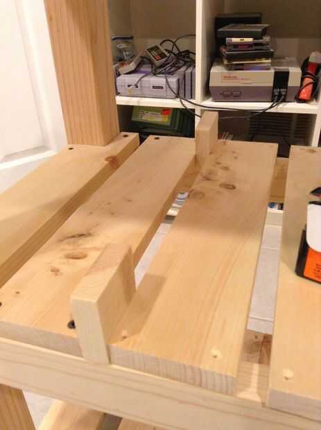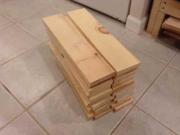 Para las piezas del estante, había comprado algunos 1 x 8 x 24" pedazos de Home Depot para algo como 36 centavos (cuando vi cómo baratos que eran, compró la totalidad de las acciones). He podido ripear estas a la derecha de ancho y cortar a la longitud para que cada una de estas tablas hizo 2 listones de estante. Cada listón era 0,75 "x 3.5" x 16 "de largo y necesita 22 de ellos para cubrir ambos estantes. Para cada lado, necesitaba cortar muescas en los listones del extremo para caber en alrededor de las piernas. Para ello, sólo mide y marcó 4 de los listones y cortar con una sierra de mano. He utilizado una sierra de doble hoja pull (como éste), que hacen cortes muy bonito. Porque yo planeado hacia fuera por lo que hubo exactamente un 0,75" hueco entre los listones, sólo utiliza dos piezas de chatarra pequeña como espaciadores entre listones y había atornillada en uno a la vez.