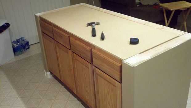 Nunca había instalado armarios piso antes así que tomé un segundo para ver cómo mis gabinetes existentes fueron atados al piso, pared y mostrador. Los gabinetes de mi cocina no están conectados físicamente al suelo. Después de que los gabinetes fueron manchados me los deslicé en su lugar. Hice deliberadamente la pared 1/2" más alto entonces los gabinetes para permitir una 1/2" pieza de aglomerado para ir encima de los gabinetes debajo del mostrador. Lo hice para apoyar la encimera más. La mayoría premade gabinetes vienen con algún tipo de soportes de metal o de plástico en las esquinas para atornillar los gabinetes a la encimera por debajo.