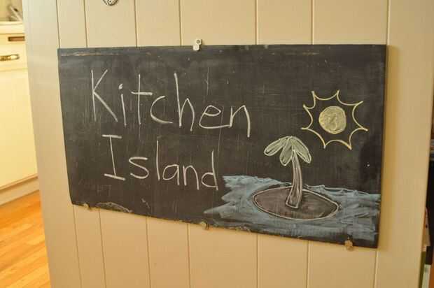 Un amigo mío había salvado una antigua escuela que fue cerrada, incluyendo quitar y reutilizar las pizarras tradicionales. Una de las pizarras tengo de él y cortar para una pizarra de tamaño infantil en nuestro modo salón. Corté la pizarra con el fin de minimizar el desperdicio, incluyendo uno que hace del "corte" piezas de un tamaño apropiado para el final de la isla de la cocina.
