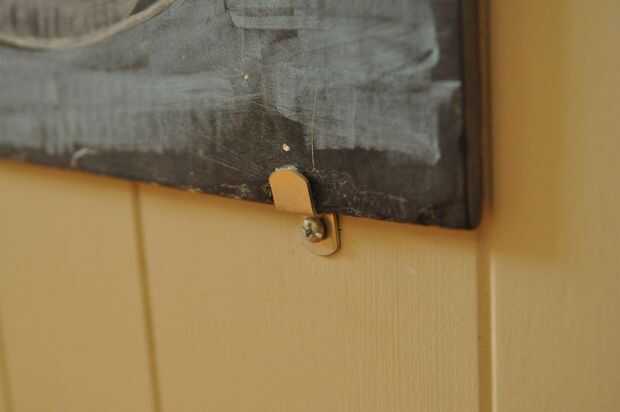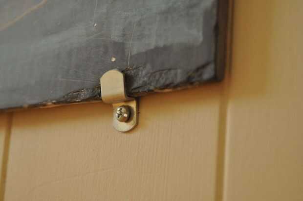 La pizarra mide aproximadamente 3/8" de espesor por 14" de alto por 26" de ancho. Se monta en el extremo de la isla con tornillos de madera y cuatro clips de metal diseñados para sujetar espejos de baño en su lugar.