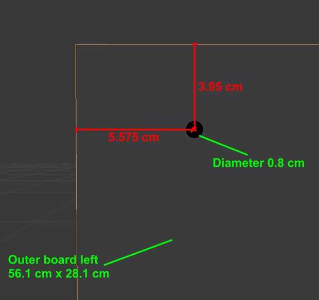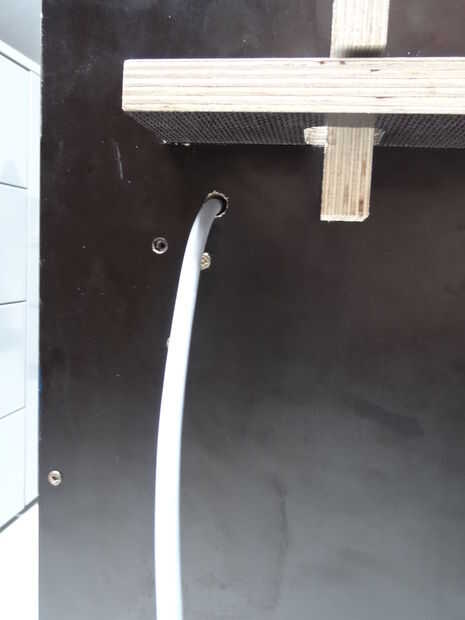 También necesita hacer un agujero para el cable de alimentación, que se pondrá encima de la energía diferentes fuentes dentro de la IsoLocker. Este agujero tiene un diámetro de 8 mm y la imagen muestra la ubicación exacta en la placa exterior izquierda.