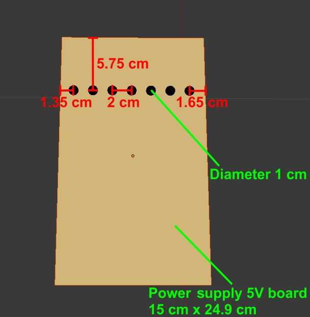 Estos se utilizan para canalizar lejos el calor residual de la fuente de alimentación y los elementos de peltier. Por supuesto estos agujeros solo hay que taladrar para el lado interno del elemento de fachada. En el cuadro 3 puede encontrar todas las distancias y medidas de los agujeros de la disipación de calor. Se recomienda para pegar algunas pantalla de la mosca en los agujeros de ese lado, que cubrirá la electrónica después, para evitar el polvo y los insectos conseguir interior fácilmente. En el cuadro 5 puede ver las dimensiones del agujero de la disipación de calor en esa Junta, que servirá como soporte para la fuente de alimentación de 5V. Obviamente, ninguna pantalla de la mosca es necesario para estos agujeros, porque no son apertura hacia el medio ambiente.