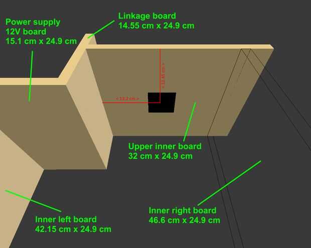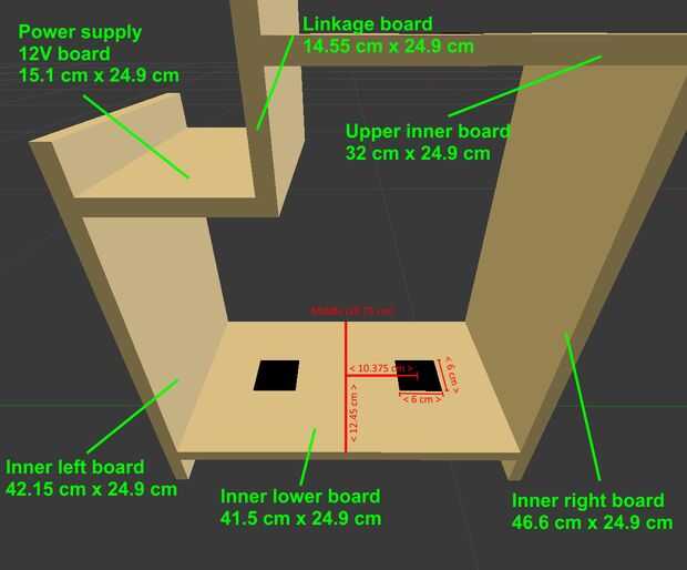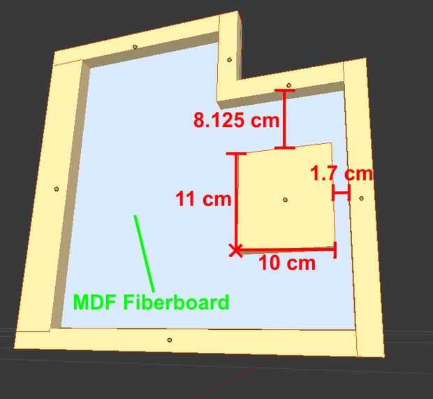 Como se puede ver en la primera imagen, los centros de los agujeros en la parte inferior son 10,375 cm desde el centro a la izquierda y a la derecha. Para el orificio inferior (segunda imagen), éste se coloca 13,2 cm del lado izquierdo. Los agujeros de la parte superior e inferior se colocan 12,45 cm desde la parte frontal / trasera y todos los agujeros tienen el tamaño de 6,0 x 6,0 cm. En pasos posteriores se cubrirán estos agujeros con placas de aluminio y los elementos de peltier se pegado junto con las placas de aluminio y disipadores de calor utilizando el adhesivo conductor térmico.