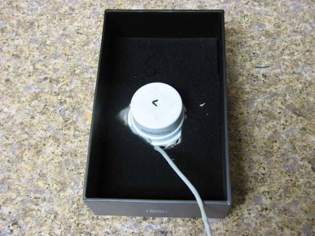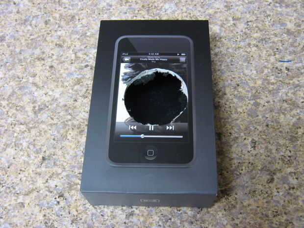 Marque la ubicación de la colocación de los altavoces previsto en las cajas. Opté por el centro. Colocación es totalmente hasta usted. Medida del altavoz justo debajo de la llanta. Recuerde que el orador debe descansar en el exterior de la caja. Si el agujero es demasiado grande, el orador será demasiado flojo, o caer en la caja completamente. Es mejor errar en el lado pequeño al cortar el agujero. Siempre se pueden quitar más de la caja, pero es muy difícil poner más caja! Usted también tendrá que hacer un agujero en la parte inferior de la caja de paso para el cable del altavoz. Una vez que tienes el corte del agujero, asegúrese de que el altavoz se adapta y se ajusta perfectamente. Pasar el alambre por el orificio principal, luego a través del paso. En este punto, se puede montar la caja del altavoz. Debe tener una caja con un altavoz pegado en la parte delantera y un cable colgando de la parte posterior. Si no es así, inténtelo de nuevo. Nota: Las cajas de los iPod tienen espuma dentro de la parte superior, esto en salir ya que ayuda a amortiguar las vibraciones.