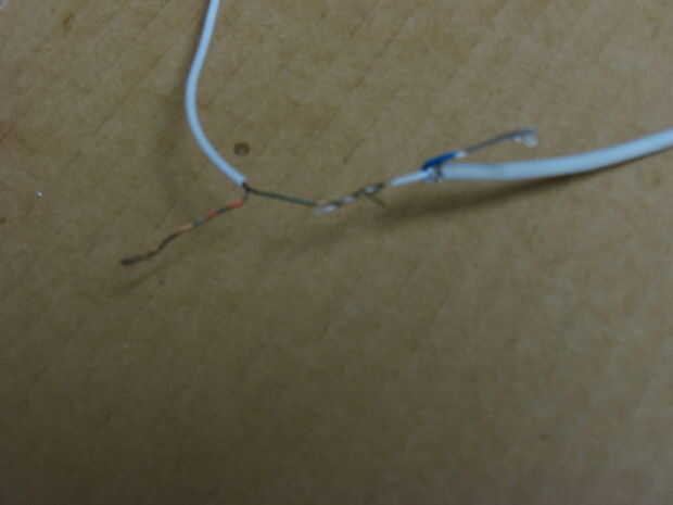 Tomar el corte termina de los altavoces en cuidadosamente retire el tubo aislante (la parte de goma blanca alrededor de los cables). Inmediatamente debajo de la vaina es una malla tejida de alambre plateado. Se trata de la protección magnética. Cuidadosamente retire esto. Se puede cortar una vez que se pela lejos de la base. Debajo de la malla de alambre se encuentra un núcleo de lo que parece papel. Pelar la hoja hacia atrás. Esto también se puede cortar, una vez el núcleo más interno está expuesto. Debajo de la hoja encontrará conjuntos de alambre forrado muy pequeño y de dos hilos aislantes. Los hilos de rosca se pueden cortar, cuidadosos de no cortar los cables. Encontrarás en un altavoz, un conjunto de cables blanco y azul, y el otro tendrá un conjunto marrón y blanco. Al menos era el caso con mis altavoces particular. Cuidadosamente la tira a las vainas de los cables más íntimos.