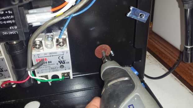 Utilizando una Dremel, cortar el tornillo que está asomando a la derecha de los relés.
