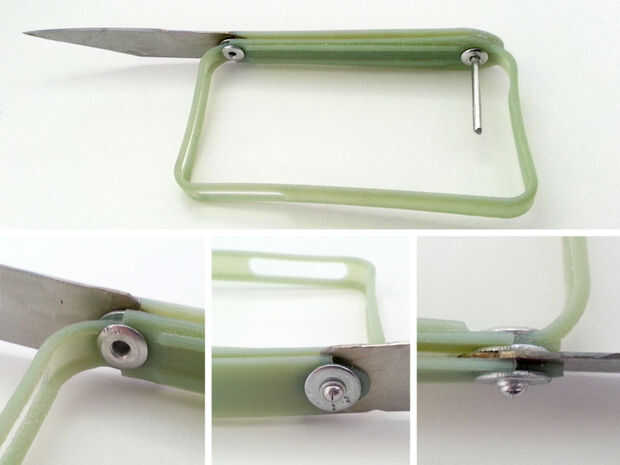 Cuando se utiliza un material más blando, es una buena idea para poner a prueba su remache en algún material de desecho para ver el resultado. Mi primer intento en el uso de la remachadora no era acertado, machacando a una de las aperturas y causando el final de partido. En otra área el material fue atascamiento en una abertura y había causado deformaciones a lo largo de la longitud de la manija, haciendo cerrar la hoja imposible.