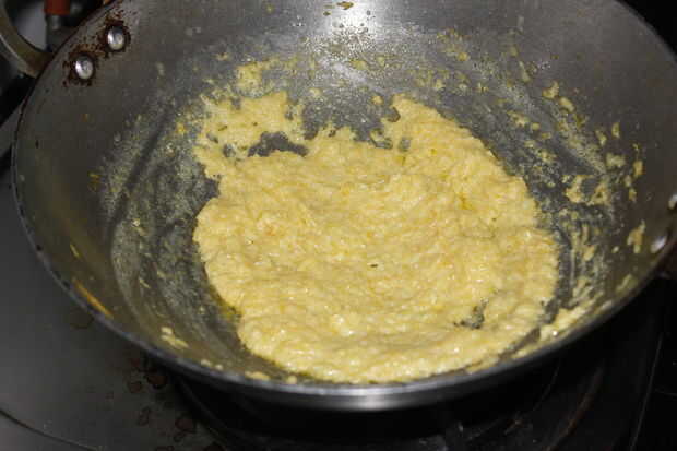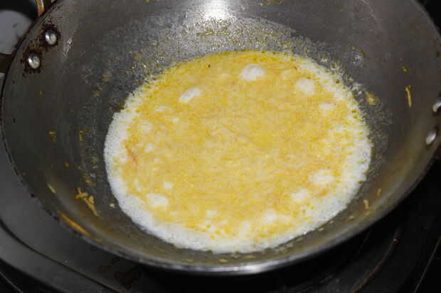Agregar 150ml de leche y seguir revolviendo hasta que la leche evapora (4 a 5 minutos aprox.)