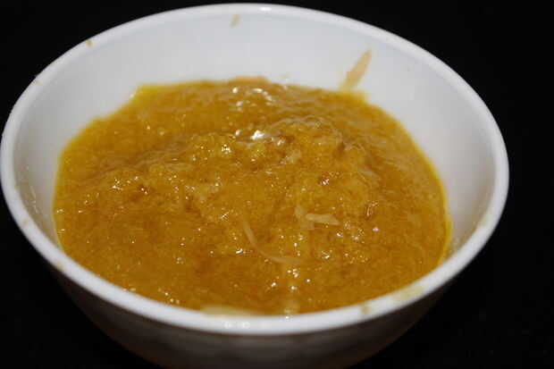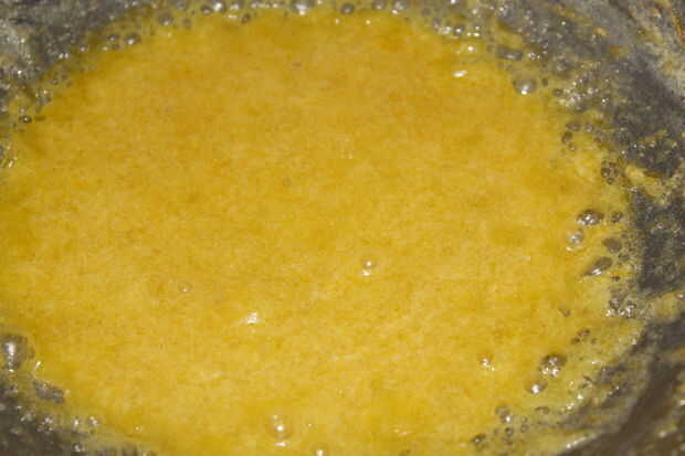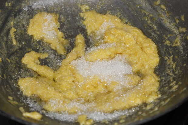 Agregar 50gms de azúcar y seguir revolviendo hasta que se convierte en amarillo brillante.