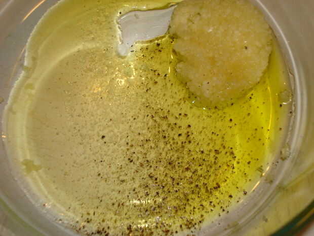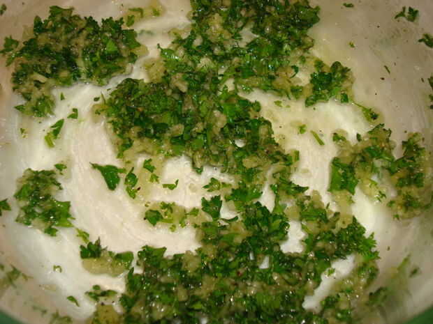 Mientras que los pimientos son asar mezclar el ajo, perejil, sal, pimienta y aceite de oliva en un tazón.
