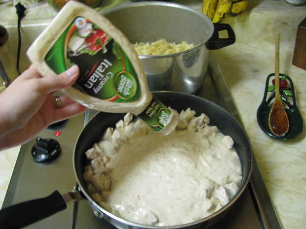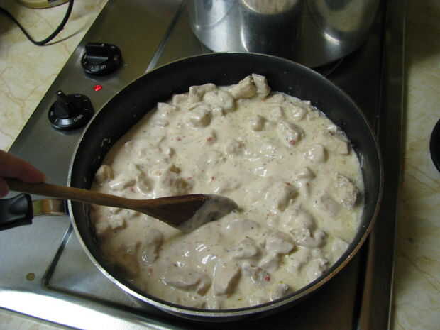Una vez hecho el pollo cocinar, añadir la botella de salsa en la sartén con el pollo y dejar cocer a fuego lento hasta que la preparación esté caliente.