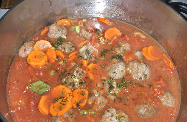 Coloque todos los ingredientes en una olla, añadir las albóndigas, vierta el tomate para cubrir