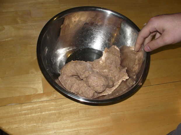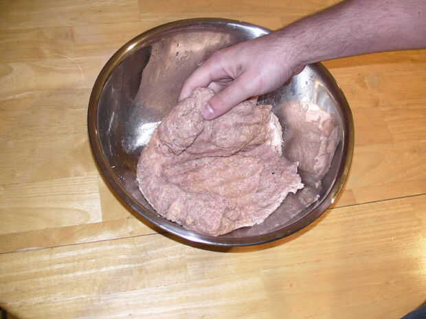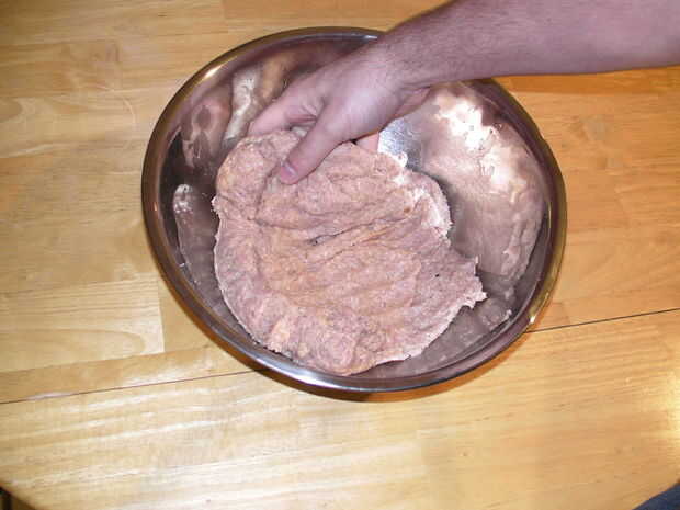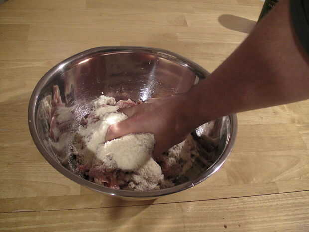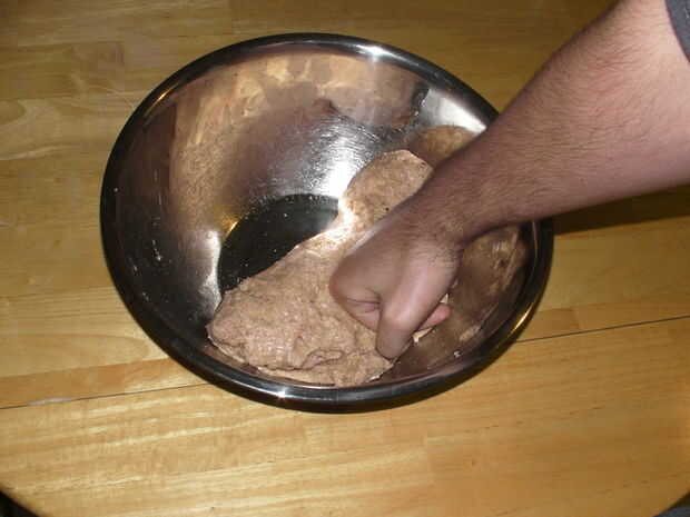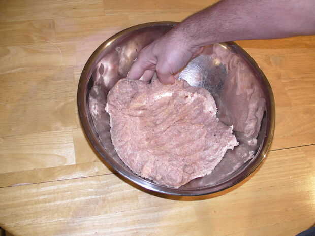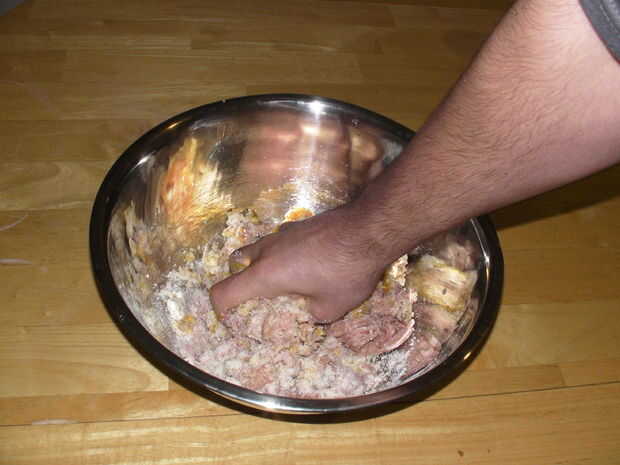 La técnica que me enseñaron es similar a amasar pan (aunque sin arrojando harina sobre la mesa). Sólo doblar la carne sobre sí mismo y aplastar juntos. Gire un poco el recipiente y repita.