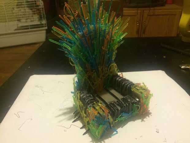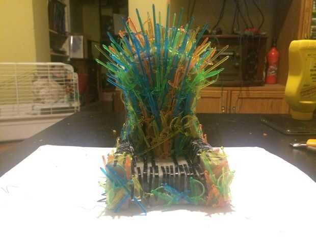 Con las empuñaduras de las espadas que desprendió, pegar hoja hacia abajo en la parte delantera de las dos filas de hojas. Luego, usando algunas empuñaduras con un poco de hoja a la izquierda en ellos, colocarlos también lámina hacia abajo detrás y entre las dos filas. Comenzarás a ver la forma icónica "Espinosa" del trono llegan juntos. También puede comenzar a colocar algunas de las empuñaduras en los brazos y parte delantera de la base.