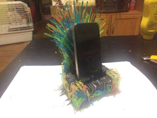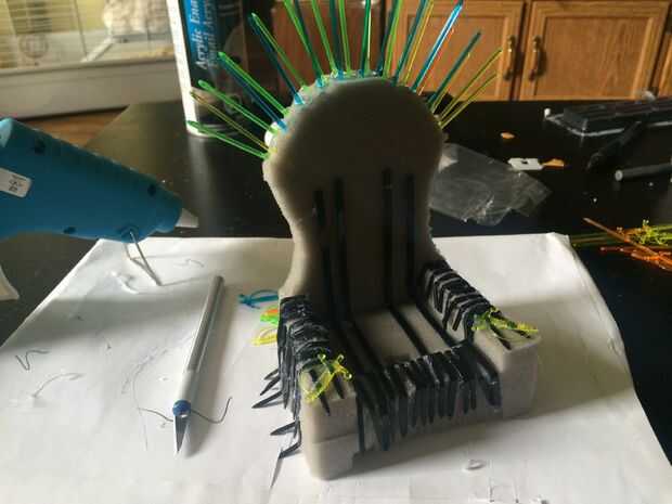 A continuación, a partir de la parte superior de la base, pegar algunos hoja de espadas completo hacia abajo para que sus empuñaduras apenas se eleven por encima del borde de la espuma. Esto le ayudará a ocultar el apoyo cuando se totalmente pintado y montado. Su forma de trabajo a partir de aquí, añadiendo más espadas ligeramente más bajas que las empuñaduras de la capa anterior. Inicio a ambos lados de la base y su forma de trabajo hacia el centro, superposición de la capa previamente y señalando las espadas algo irregularmente hacia el centro de la base. Medida que se baja, permiten algunas espadas completos penetrar en la espuma de la base, como esto ayudará a fortalecer la estructura de su trono para que el apoyo será capaz de soportar el peso de su teléfono si su espuma no es particularmente rígida. Cortar las hojas de las otras empuñaduras medida que se acerca a la parte inferior para que ajuste con facilidad y de modo que usted tendrá un montón de hojas a otros lugares. Repita este proceso para la espalda.