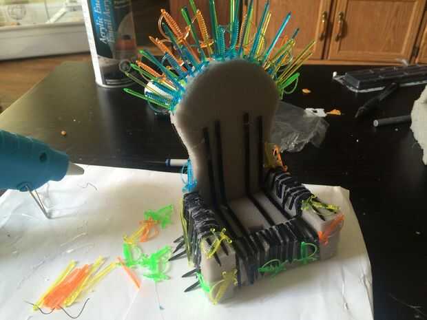 Usando las espadas completas, hojas y empuñaduras que queda, agregar más al frente del respaldo, los costados de los brazos, la parte delantera del asiento y los lados de la base. También añadir más señalaron hacia arriba las hojas en la parte superior de la base en cualquier espacio vacío usted puede encontrar para darle un aspecto más monstruoso. He utilizado literalmente cada una espada de plástico que tenía (más de un centenar), razón por la que esta parte es tan desperdiciador de tiempo.