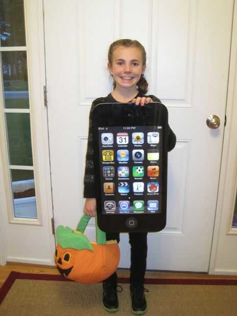 Vimos una versión más vieja, más grande de un traje de iPhone que un padre hace por sí mismo a usar mientras que truco o trato con su hija.