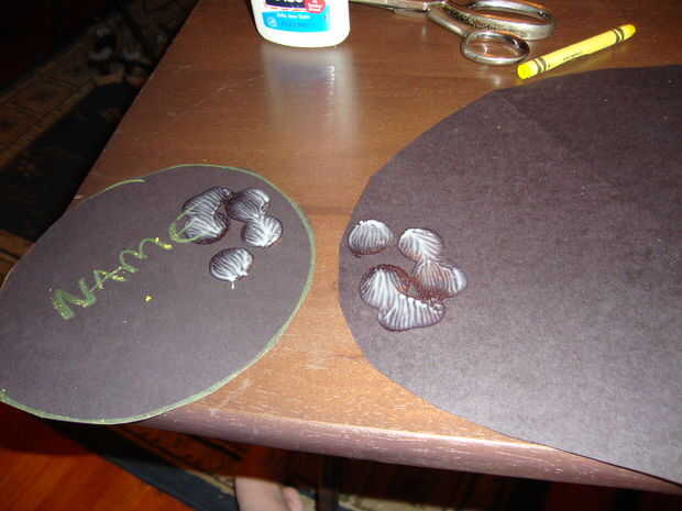 Tienen el círculo de la cabeza con su nombre frente a ellos y tres gotas de pegamento en una fila y tres gotas más debajo de este. (seis en total) Les recuerdo: "Dot Dot no mucho" les recuerdo debe ser su punto de pegamento entre el tamaño de una semilla de manzana a un núcleo de maíz. Estos son objetos los niños están acostumbrados a ver (a menudo en las bandejas del almuerzo de escuela) por lo que les da una buena idea sobre cómo deberían ser sus puntos de glu.