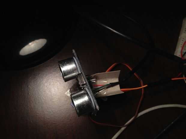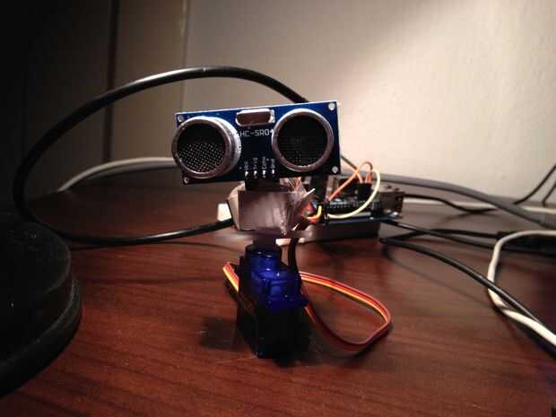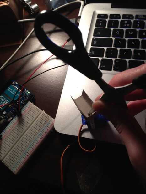 A continuación, hacer un pequeño agujero en la pieza de cartón para poner uno de los tornillos pequeños a través de él. Atornille el motor servo, así que usted puede poner el sensor de ultrasonidos en la parte superior. Para asegurarse de que permanece allí, aplique cinta (puede que desee hacer lo mismo para el motor servo si sigue cayendo).