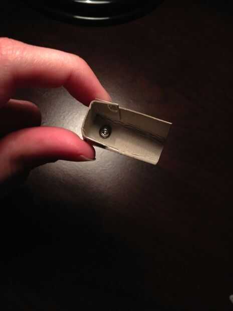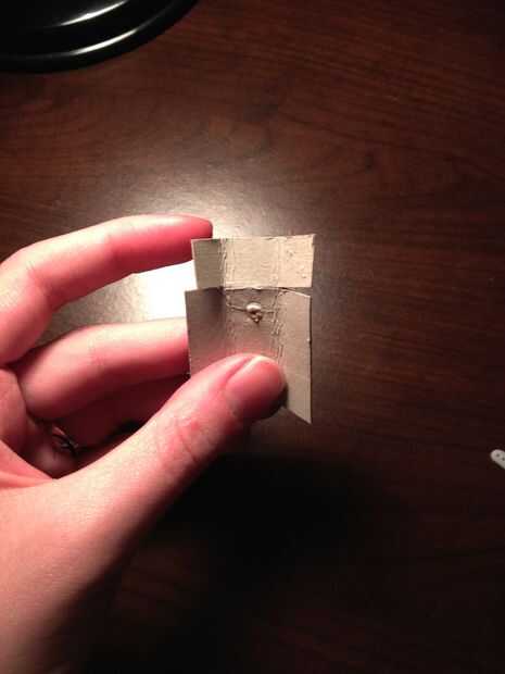 Segundo paso: cortar un pequeño cuadrilátero de la pieza de cartón que tienes. Que sea sólo un poco más grande que los puertos del jefe del perno. Después de esto, corta dos pequeñas lagunas en el extremo corto de la pieza de cartón, un poco por encima de la media. Dejar cierta distancia entre los huecos, usted no quiere cortar la pieza de cartón por la mitad [mira la segunda imagen de referencia).
