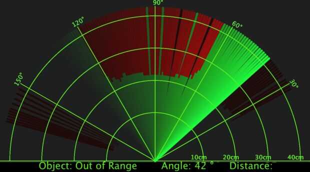 Después de esto, ejecute el código y se debe abrir una nueva ventana, con el radar muestra como en la imagen. Después de esto usted puede jugar con el sensor para un poco!