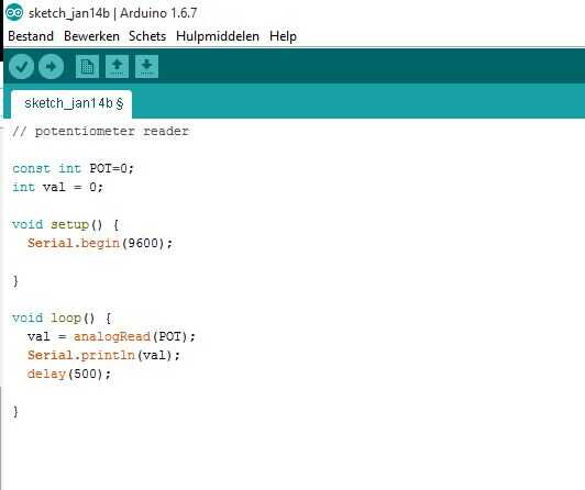de tweede afbeelding es potenciómetro de de código om me te lezen. azada ik ook draaide aan de potenciómetro hij bleef altijd 1023 geven, afentoe met een sprong naar een getal tussen 1018 en 1023.