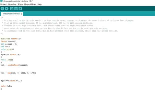 Zoals en comentarios staat, moet dit de código repusado, warabij de servo bij 0 snel linksom draait, bij 90 stilstaat en bij 180 snel rechtsom draait. Het kan zijn dat dit een andere código es, maar ik heb deze gebruikt omdat deze wel draaide terwijl de potenciómetro het niet escritura.
