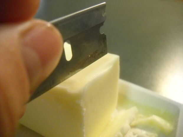 Luego corta dos cuadraditos pequeños de mantequilla con una cuchilla de afeitar y colocarlos en la cima de la pila de panqueques. Añadir unos corte fresas a un lado, o en la parte superior. Cubra con una cucharada de jarabe de arce. Admirar su obra, y luego comerlo!