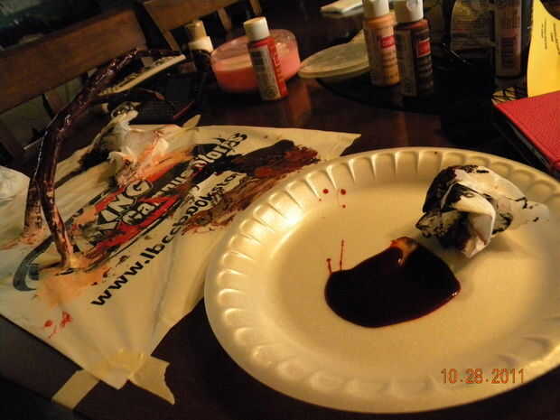 Empezar por pintar toda la longitud del dedo con su pintura del tono de la piel. Antes de que seque, otras pinturas el color en la parte superior de la capa. Uso muy negro en la punta y se descolora hacia fuera como bajar. Mezclar en un Borgoña y pequeños pedacitos de la red. Mientras está todavía húmedo, puede Agregar parte de la sangre falsa. Secará. Esto está bien. Añadirá a una especie de efecto de sangre seca, y usted puede siempre volver a aplicar sangre cuando quiere ser sangriento.