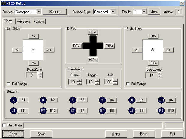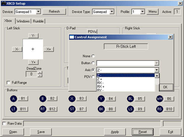 Abra XBCD. Haga clic en Inicio > programas > XBCD > utilidad de configuración. (Nota: la ubicación puede ser diferente si se ha seleccionado para poner los accesos directos). La ventana XBCD debería verse como la primera foto. Ahora, cambiar la RX - Z - y RX + Z +. También, ajustar la sensibilidad de la zona muerta en el palo derecho a catorce.