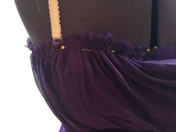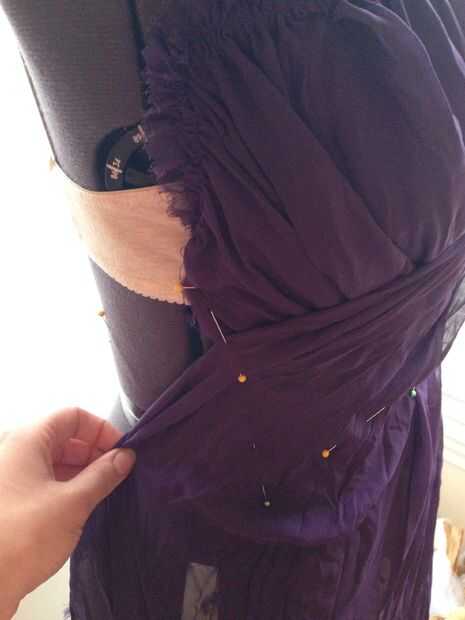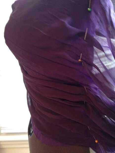 Prender a lo largo de la parte superior de la novia a la izquierda y tire de la tela a través de la blusa al lado opuesto y pin abajo de la costura lateral. También pin en la parte inferior. Otra vez, cosa a lo largo de todas partes que han fijado.