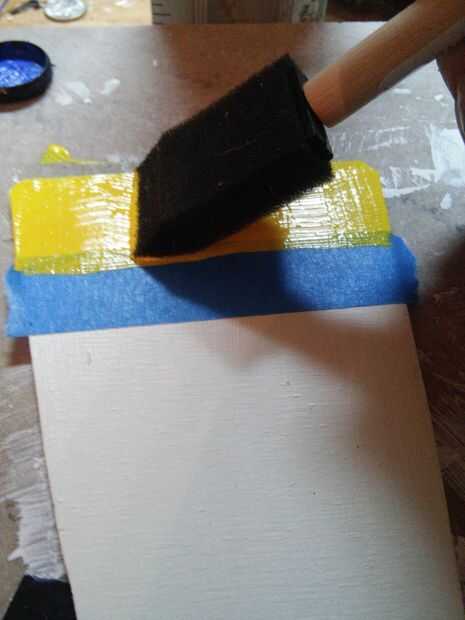 Cartilla de cepillo en los trozos de madera que acaba de corta y lija. Dejar secar, luego pintar con tus colores de preferencia. Pintar sus piezas blanco (o con su encendedor color primero), luego utilizar cinta de pintor para hacer la raya. El borde superior de la raya debe ser aproximadamente 2.3 cm desde el borde superior de cada pieza.