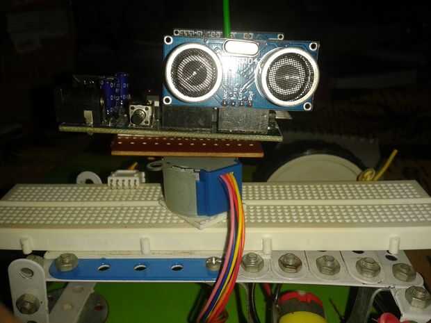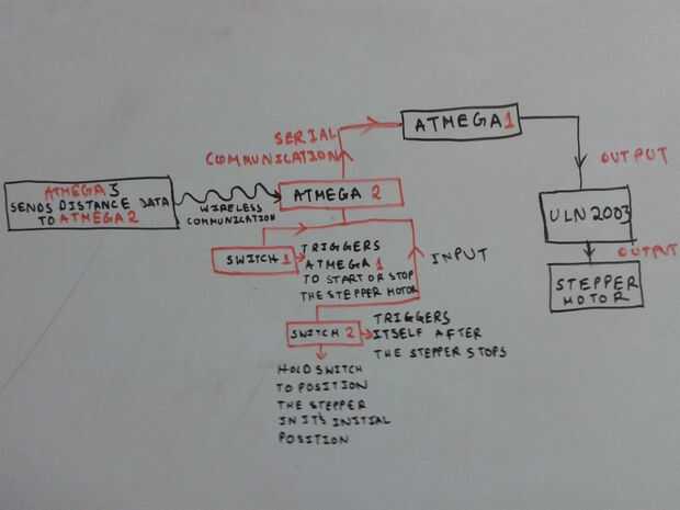 - Este paso a paso va 4096 pasos de 1 rotación completa. Cada 64 pasos que el sensor de distancia se ping (activados) y los datos de distancia se enviará wireless a otro Atmega que se fija a la mesa de pan