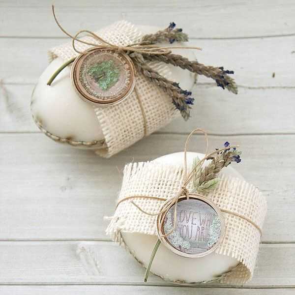 Para recrear este look: barras de jabón envuelto con tiras de color arpillera atada con cordeles. Para terminar, se adhiere una etiqueta engomada decorativa de la arte de Papaya a una pequeña etiqueta con bordes de metal y atarla con la cuerda.