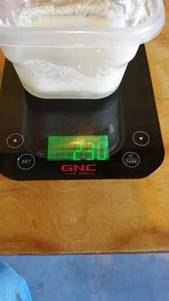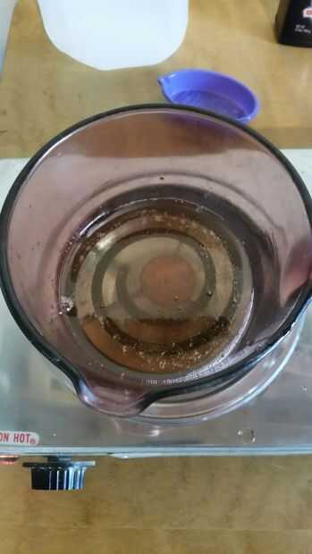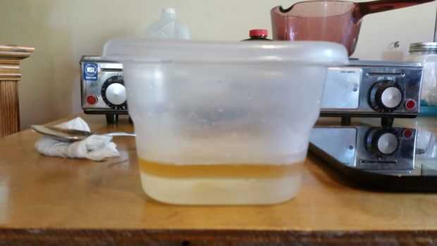 He añadido tocino del frasco a un recipiente sobre la báscula hasta 70 gramos vale la pena. Luego calentar a fuego lento derretir la grasa y mezclado con agua para limpiar las impurezas de la grasa. Se puede ver en la foto cómo la capa de grasa flota encima del agua. Esto ahora está listo para pasar la noche en la nevera.